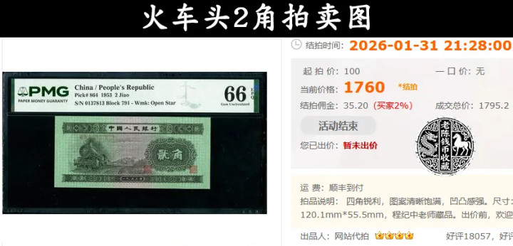 比如上头这张在1月31号拍出的2角纸币,天然冠号数字部分“0137813”内部有3和7,最终如故拍出了1795.2元。